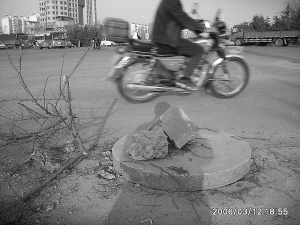 周口市区太昊路和中州大道交叉口西南角,一个窨井盖整个凸出地面,旁边放一树枝作为警示。据附近居民介绍,这个窨井之前几个月一直张着“口”,几天前才由相关部门盖上盖子的。