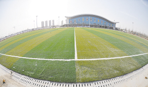 市体育中心这块人工草坪足球场采用的是足可乱真的高级塑胶。