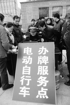 3月15日,江苏丹阳市公安部门民警在街头为市民办理电动自行车牌号业务。当日,丹阳市公安部门为全市200多家电动自行车销售点发放了“电动自行车带牌销售点”牌匾,并在市区主要干道现场为市民办理电动自行车牌号业务。据悉,从3月15日起,镇江地区新销售的电动自行车必须具备牌号,之前已销售的无牌号电动自行车须登记后获取牌号,以便于对电动自行车及其车主进行身份识别。新华社发