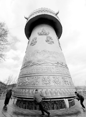 3名参观者在香格里拉县独克宗古城推动巨型转经筒(3月14日摄)。云南省迪庆藏族自治州香格里拉县独克宗古城有一个巨型转经筒,高达21米,总重60吨,三四个人一起合力推才能将其转动。据当地旅游部门介绍,这个转经筒为镏金纯铜制作,筒内藏有经咒、六字真言124万条和多种佛宝16吨。新华社发