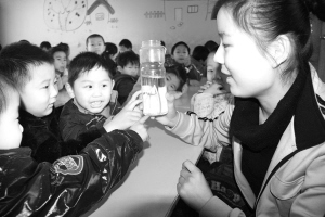 当日,河北省邯郸市广平县水利及环保部门的工作人员来到该县广平幼儿园,为孩子们上节水环保课,帮助孩子们从小树立节约用水和保护水资源的意识,迎接3月22日第19个“世界水日”的到来。新华社发
