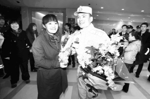 3月21日,在北京首都国际机场,中国国际救援队队员陈庆开(前右)的妻子张虹霞(前左)前来接机。当日零时许,中国国际救援队在圆满完成日本地震海啸灾区救援任务后顺利返回,抵达北京首都国际机场。新华社发