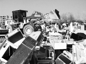 3月23日10时许,商水县阳城公园,随着民警的一声令下,一辆铲车向堆放着“金色盛典”、“吉祥龙”、“世界宝马”等赌博机的“赌具山”狠狠砸去,半个多小时后,500余台赌博机被砸为碎片,围观市民见此情景无不拍手称快。