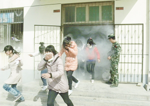 当日下午3时许,该校学生正在上课。突然,校园内警报声响起,各班级学生冲出教室。楼道口有消防官兵设置的模拟烟雾,学生们弯着腰,手捂着嘴(如图),以最快的速度向学校指定地点跑去。疏散到操场上的学生,随即站成整齐的队伍。全校学生从警报响起到到达指定地点仅用1分26秒。
