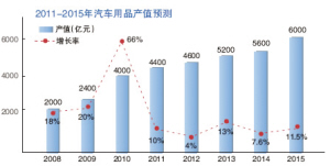 据慧聪邓白氏研究院统计的数据显示,以每辆新车一年购置汽车用品5000元计算,将为汽车用品产业直接新增千亿元市场份额。2010年,中国汽车用品市场总产值已超过4000亿元;2015年,汽车用品产业新增市场份额将达1500亿元,市场总产值有望达到6000亿元。