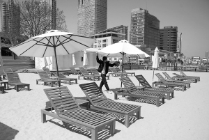 3月31日,工作人员在位于上海黄浦江边的人造沙滩上打开遮阳伞。近日,一片金黄色的“人造沙滩”亮相上海南外滩,并正式对外开放,供市民和游客在黄浦江边享受日光浴。