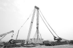 图为500千伏三相一体变压器在周口港起吊上岸的情景。