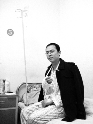 昨天上午,记者见到了坐在病床边打点滴的吴森林(如图)。对于抓小偷挂彩一事,吴森林说,他一点也不后悔,今后再碰到小偷,他还会冲上去的。