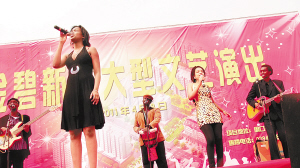 据了解,他们是“非鹰乐队”,由3位男歌手和2位女歌手组成。他们演唱了《童话》、《月亮代表我的心》、《甜蜜蜜》等歌曲,现场掌声不断。这让金碧新城在展会刚开始就赚足了人气。