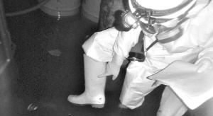 4月8日,日本福岛核电站内,工作人员展示积水的深度,这栋建筑专门用来储存那些具有高核辐射的积水。