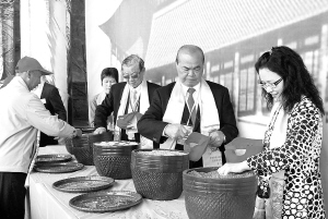 近日,在鹿邑举行的中华李氏大宗祠始祖殿落成庆典暨全球李氏宗亲祭祖大典上,来自世界8个国家和地区及国内13个省市的360名李氏宗亲代表出席盛典。祭祖大典结束后,来自新加坡、印尼和台湾的李氏宗亲代表抓一把供桌上的五谷,小心翼翼地放进自己的旅行帽内,捎回家乡,祈福纳祥。晚报记者 侯国防 摄 线索提供 蒋保庆 闫子健