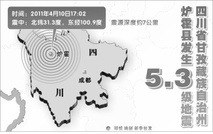 据新华社电 据中国地震台网测定,北京时间4月10日17时02分,在四川省甘孜藏族自治州炉霍县(北纬31.3°,东经100.9°) 发生5.3级地震,震源深度7.0公里。记者11日从民政部救灾司获悉,据初步统计,四川省炉霍县5.3级地震目前造成甘孜州炉霍、甘孜、新龙、道孚4县18个乡镇6000余人受灾,2300余人紧急转移安置,900余间房屋倒塌,5000余间房屋损坏,直接经济损失4000余万元。