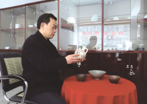 在另一展柜里,记者看到了清一色的白瓷,白中泛青,青中隐白。通过灯光一照,瓷胎立刻晶莹透亮,上面的花纹生动传神。张先生说,这种瓷叫湖田窑,是宋代仿青白玉质烧制的精美瓷器,宋代女词人李清照作的“玉枕纱厨,夜半凉初透。”词中所说的玉枕就是湖田窑仿青白玉瓷枕。湖田窑精美绝伦,像这样口径20厘米的大碗,碗壁厚度还不足2毫米,里面还有刻花工艺。有人形容湖田窑像柴窑一样“青如天、明如镜、薄如纸、声如磬”,娇弱得有“恐被风吹去,被太阳晒熔”的感觉。