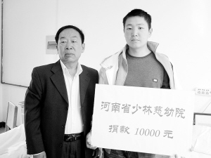 在周口市慈善总会办理过相关手续后,记者陪同杨晓波来到周口市中心医院透析室看望陈煜。“我是河南省少林慈幼院工作人员,我们通过《周口晚报》了解到你的病情和家庭情况后,决定对你进行捐助。这1万元钱是代表少林慈幼院和少林寺方丈释永信捐助给你的。”说话间,杨晓波把写有“河南省少林慈幼院捐款10000元”的捐款牌递到陈煜手中(如图)。随后,杨晓波坐下来与陈煜交谈,“好孩子,你现在还很年轻,要鼓起勇气,树立信心,与病魔做抗争。听说你哥哥正在上军校,等你的病好了,也要像你哥哥一样有出息。”