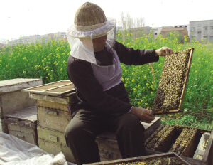 4月12日,家住商水汤庄的养蜂人周老汉在商水县城郊的一片油菜花旁,戴着面罩忙着取蜂蜜。时下,正是油菜花盛开的季节,乡村田野成片油菜花海引来成群蜜蜂,也招来许多养蜂农民来此“安营扎寨”。