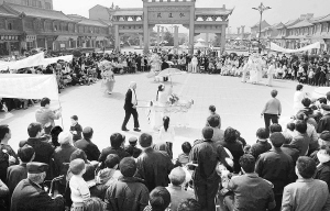4月12日上午,在鹿邑县明道宫弘道苑广场,民间文艺演出队正在为游客表演行旱船、抬花轿、推花车等节目。据了解,老子生日庙会期间,鹿邑县政协组织全县80多个县直单位和乡镇为游客表演舞狮、舞龙、盘鼓、秧歌等20多种文艺节目。3个文艺演出队每天巡回县城主要街道和景区景点进行表演。精彩的文艺演出既为游客奉献了一道视听盛宴,又为老子庙会增添了一道靓丽风景。