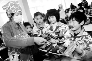4月14日,浙江省上虞市华维文澜小学几位学生领取粗粮午餐。
