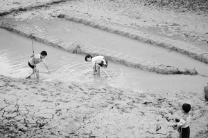 今年以来,江西降雨异常偏少,尤其是赣南地区春旱严重,1月至4月上旬,全省平均降雨量206毫米,仅占同期多年均值的49%,尤其是赣南局部地区春旱严重,春耕生产和城镇饮水都已受到较大影响。图为4月16日,在江西省遂川县,孩子们在快裸露出来的河床上捉鱼。新华社发