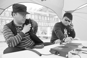 “香港,香港,三川呼叫”“三川,三川,香港收到”……昨天上午,周口“火腿”的无线电呼叫声,从沙颍河岸边不停地传出。记者循声找过去,很快就在沙颍河公园一角发现了一个架有天线的帐篷,原来,这里就是“火腿”们的临时通联点。记者一走进这个临时通联点,就看到两位“火腿”正戴着耳机专心地进行通联,而电台正“嘟嘟”的发声(如图)。