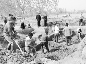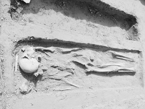 清代窑址位于商水县产业集聚区某企业项目工地内。昨日,记者赶到发掘现场时,看到10余名工人正在对窑址进行抢救性挖掘(大图)。经测量发现,该窑窑室长7米、宽3米,系保存相对完整的清代窑址,窑内有未出土的砖。在窑址附近,还有一座夫妻合葬墓,男主人高约1.7米,与女主人面对面,其尸骨清晰可见(小图),墓内出土1对银耳钉、10枚乾隆通宝。