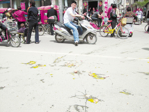 本报讯 昨天中午,一队婚车停在周口市区建设大道一家饭店门前。就在新郎新娘下车走向饭店时,在饭店门前等候的“亲友团”中,蹿出数个年轻的身影,手中拿着鸡蛋,对准新人一顿猛砸,新人庄重美丽的婚礼礼服顿时变得狼狈不堪。欢笑声中,“肇事者”们一哄而散。谁也没注意到,不远处一名环卫工人望着地上的鸡蛋壳(如图)满脸无奈。