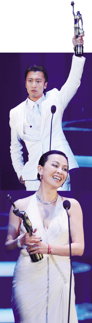 本报综合消息 第30届香港电影金像奖颁奖典礼4月17日晚在香港文化中心举行,各大奖项揭晓。颁奖现场放着《胭脂扣》《阿飞正传》等历届金像奖获奖电影片段、张艾嘉张国荣张曼玉梁朝伟等领奖片段,嘉宾唱着老歌,主持人讲着老段子……三十而立的金像奖今年既怀旧又自恋。最终,徐克凭《狄仁杰之通天帝国》获得了最佳导演,最佳男女主角都没有悬念,最佳男主角给了谢霆锋,而最佳女主角刘嘉玲获得。金像奖重港片,所以内地参与的《狄仁杰》没有笑到最后,被封为代表了香港电影精神的港片《打擂台》爆冷门获得了最佳电影。