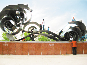 昨日17时许,记者来到这里看到,不少市民或是散步或是活动筋骨。在一座4米多高的雕塑上,虽然写有“严禁攀爬,后果自负”字样,但不少小孩却攀爬到上面,在雕塑的空隙里钻来钻去嬉闹玩耍。更有甚者有些家长竟助“一臂之力”,把孩子抱到雕塑上面,看着他们在上面玩。