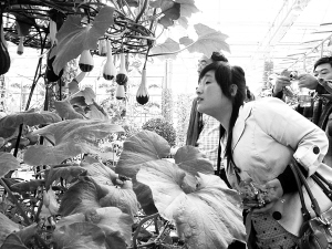 记者看到,这里不仅有日光温室、PC板温室、生态温室,而且还荟萃了各种蔬菜:巨型南瓜、“麦克风”状的小南瓜(如图)、“满天星”辣椒、紫长茄等。