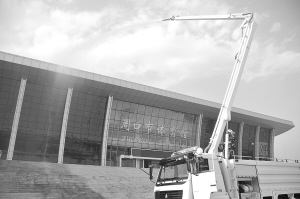 昨天下午,市消防支队出动10多辆消防车、50多名指战员来到市体育馆举行了消防救援综合演练,这是市体育馆自建成后首次进行的消防演练。图为消防官兵操作高喷消防车向市体育馆“起火点”喷水。