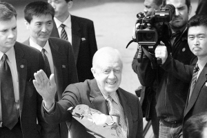 4月26日上午,美国前总统吉米·卡特(中)乘坐包机抵达平壤顺安机场,开始对朝鲜进行访问。卡特一行是乘专机从北京出发,于当地时间10时30分左右抵达平壤顺安机场的。一同乘机抵达的还有芬兰前总统马尔蒂·阿赫蒂萨里、爱尔兰前总统玛丽·鲁滨逊和挪威前首相布伦特兰,以及随行人员和十多名记者。据外电报道,卡特一行此次访朝目的在于讨论包括无核化在内的缓和朝鲜半岛局势方案以及对朝鲜进行人道主义援助的问题。新华社发