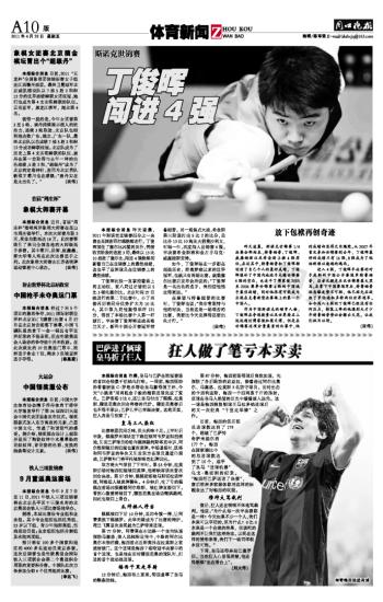 本报综合消息 昨天凌晨,2011年斯诺克世锦赛四分之一决赛在英国谢菲尔德继续进行。丁俊晖顶住了塞尔比凶猛的反扑,凭借收官阶段的连胜3局,最终以13比10战胜了塞尔比,闯进4强继续刷新着自己在世锦赛上的最佳战绩,这也平了亚洲球员在世锦赛上的最佳战绩。