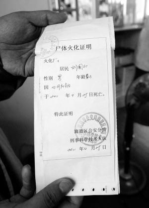 这是在鸡东殡仪馆找到的地方公安局为疑似遇难矿工开具的死因为“心脏病”的火化证明。
