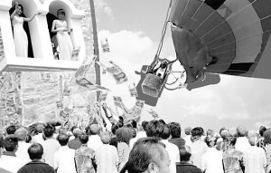 本报综合消息 4月30日14时许,一家正在江苏世业洲假度区开发产权式酒店的开发商为吸引更多的游客前来看房,用热气球载着3位美女升空抛钱。撒了数百元钱后,开发商再度让美女站到楼上向空中撒下万元现金(下图)。