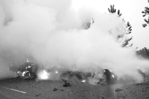 5月2日5时55分,西华县消防大队接到报警后,9名消防官兵、两辆水罐车火速赶往事发地点。抵达事发现场后,消防官兵看见一辆15米长、满载鞭炮的大货车车厢里不断传出沉闷的爆炸声,爆炸产生的浓烟笼罩着整个车身,爆炸产生的巨大气浪和向四处飞散的爆炸物,让强行靠近灭火的官兵面临很大危险(小图)。见此情景,消防官兵迅速用两支高压水枪压制明火,以防止连环爆炸(大图)。