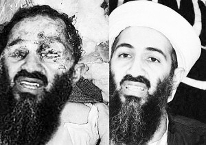 法新社分析后称左边这张拉登遗体面部的照片是右边照片处理后所得,是假的。