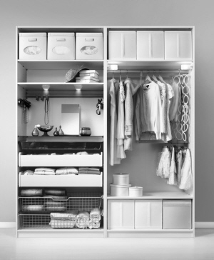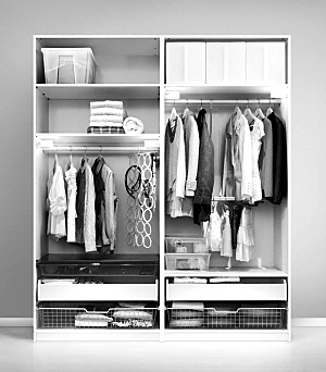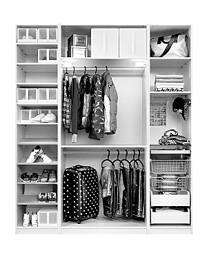 当他与她相遇走到一起会如何?随着他搬到了她家,她的专属衣柜变成了两人的共有空间。因此,她放弃原本内嵌的梳妆台,腾出更多的空间存放他的衣物。其他的小配件,利用塑料收纳盒收藏起来,让找寻变成一件容易的事儿。另外,在衣柜中加上一个L形的衣架,充分利用衣柜下部的空间,存放她心爱的小礼服。别小看这样的变化,虽然空间被两人分享,但却没有影响两个人衣物储存的需求, 现在10件小礼服依然可以被妥帖收纳。一个衣柜,将两个人的行头都收纳其中。