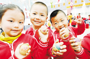 5月4日,苏州虎丘中心幼儿园的孩子们展示各自绘制的彩蛋。