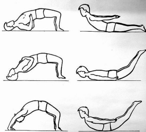 腰椎三点式、五点式、飞燕式锻炼示意图