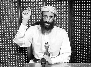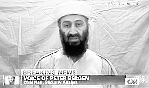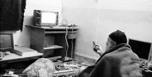 胡须花白的拉登身上裹着毯子,坐在一个破旧的小电视机面前,聚精会神地观看有关自己最新讲话的卫星电视新闻节目