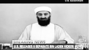 另一段录像中,本·拉登胡须花白,身披一条毯子,躬身而坐,观看电视中关于自己的画面,内容看起来是卫星电视直播节目。他手握遥控器,不时更换频道。