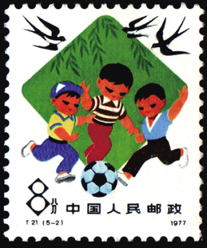 T.21《从小锻炼为革命》邮票中“小小足球传友谊”(图6)一枚,表现了少年儿童在春光下快乐地踢着足球。设计者以写实的手法为我们展现了一个充满活力和动感的春天。