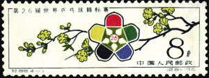 纪86《第26届世界乒乓球锦标赛》邮票中的“会徽及迎春花”(图7)一枚,设计者以迎春花衬托出由5只乒乓球拍摆出的梅花状会徽图案。1961年春,第26届世乒赛在北京举办。邮票选用迎春花作背景图案,既表明了此届世乒赛举办期间的季节,又预示着中国体育走进美好的春天。