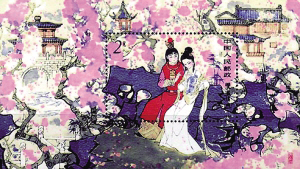 T.69《红楼梦》小型张“双玉读曲”(图4)展现了桃枝掩映下,宝玉、黛玉同读《西厢记》的情景。两颗年轻的心在这明媚的春光里,默默传递爱意。