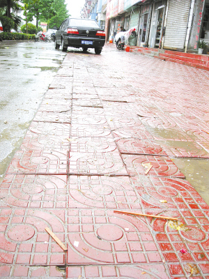 图片说明:汽车行在人行道是彩砖破损松动的重要原因。