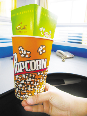 昨日上午,记者在奥斯卡电影城购买一桶爆米花,仔细观察发现,爆米花桶看上去是用普通纸板做的。影院销售人员告诉记者,售卖的爆米花桶都是自制的,爆米花在电影院常年有售。记者看到,这里使用的爆米花桶桶身除标有爆米花的英文字母、影院名称、影院电话及地址外,并无生产厂家及QS质量标志。