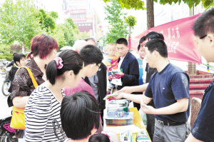 5月15日是我国第十八个“防治碘缺乏病日”, 今年的宣传主题为“坚持科学补碘,预防碘缺乏病”。当日,周口市各级盐业管理部门积极配合疾病预防中心,利用多种形式开展食用加碘盐科普知识宣传,并走上街头向过往群众散发碘缺乏病防治基本知识及有关资料。图为市盐业管理局直属分局的工作人员在向群众展示各种假冒食用碘盐,教群众如何鉴别真假食用碘盐。