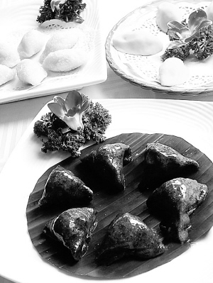 别于其他地方的做法,台山人做的白粽,内置咸肉、蛋黄、花生、虾米、腊肉等配料;还有做成三角形的,叫角粽。他们把枧水粽切片晒干,与陈皮、鸡爪芋等一同煮的糖水,十分清润可口。(中旅)