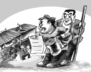 贵州茅台镇以建白酒一条街提升形象为由,5月1日突然通知百家商铺,要求在2天内搬迁,经济损失没人管。许多商户未按时搬迁,镇政府派出由城管、公安等组成的执法队,强扣店铺货物,拿棍锤砸东西。副镇长说,补偿安置方案不可能,政府没有资金买单。(据5月15日央视)