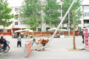 昨天记者在现场看到,被撞歪的路灯底部基座已露出地面,灯头卡在一根电线上,随时有可能倒地、将电线压断,给附近居民带来危险。附近居民尹先生说:“一到下班时间,这里过往行人非常多,真怕它(被撞歪的路灯)倒了,砸到人。希望有关部门来换一个新的。”晚报记者 宋风 摄