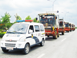 5月24日,在市区周口大道上,一辆警车正为路过我市南下跨区作业的“麦客”带路。当日,来自山西的多台大型联合收割机组成的夏收“跨区作业队”经过市区。据介绍,5月中旬以来,来自山西、河北、内蒙古等地的“麦客”陆续经过我市,我市交警、农机等部门主动为“麦客”提供必要的帮助,全力护送“麦客”南下。